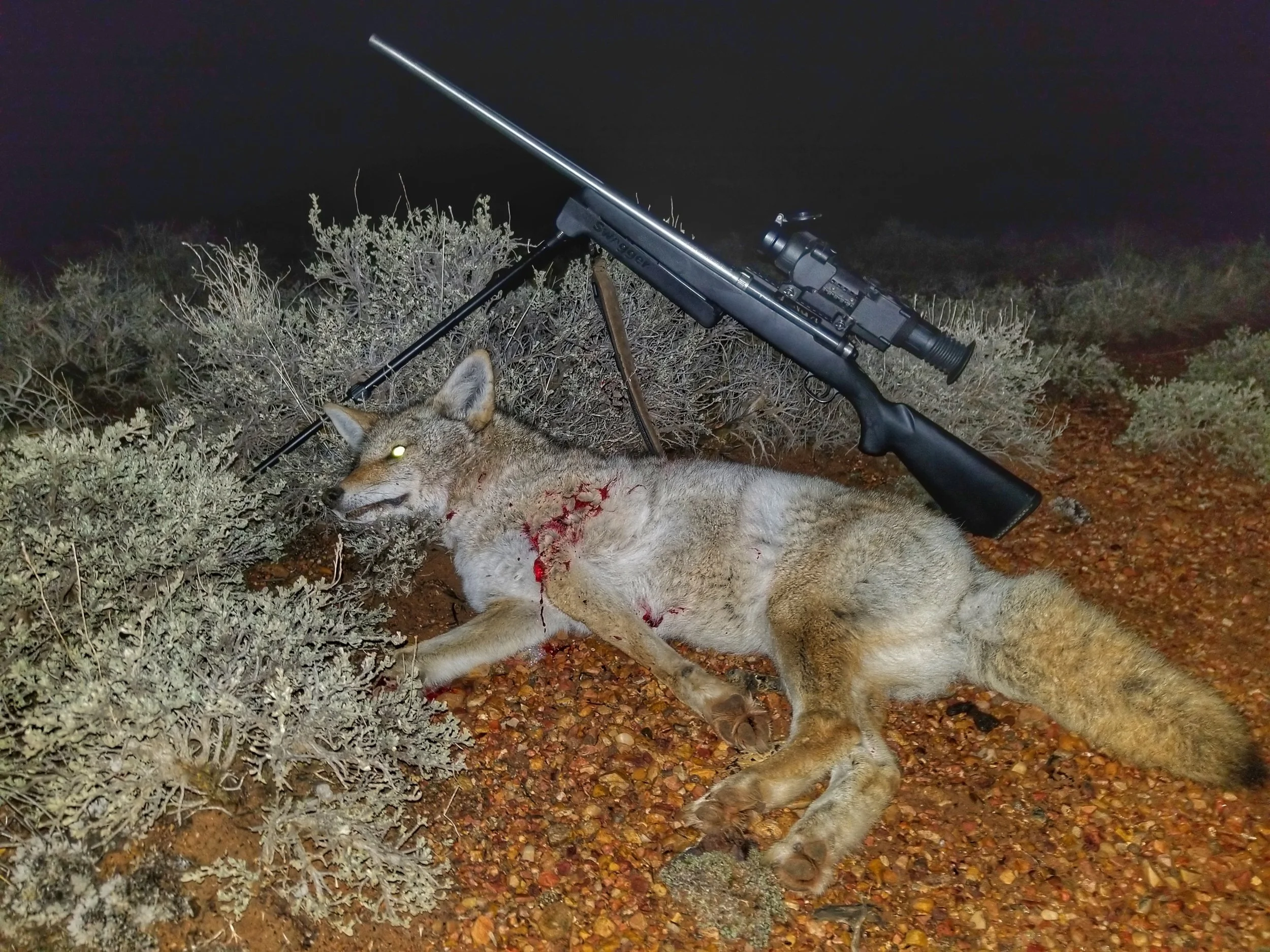 I purchased the Swagger primarily for my nighttime, thermal equipped 22-250 since it weighs about 17lbs, but with the plans to use it on my AR-15 and elk/deer rifles as well if need be. It showed up, I slapped it on my 22-250 and gave it a whirl. I liked that it allowed the mobility I needed from a seated position, as well as the option that it gave me to shoot from a standing position while supporting the front of the rifle on with my hips by kicking the legs back in. After a quick run through to ensure it worked as it should, I was out the door, headed out in the darkness in pursuit of the Wiley Coyote! Overall, the bipod worked pretty efficiently on my bolt gun. It allowed me to sit down comfortably, scan and shoot quickly. One major plus, was the ability to shoot standing supported. Night hunting predators can be a lot of work. One must be constantly moving and scanning through the thermal scope to ensure a surprise visit of a dog, cat or other animal doesn’t end up in your lap, so I spend a great deal of time standing in the darkness, spinning and scanning each sector. The ability to support the weight of the rifle/scope with my hips was a huge advantage and didn’t wear me out as quickly, as I had previously had to support the weight with just my arms, which can get tiring after a bit, making shooting precision shots more difficult with fatigued shoulders and arms.